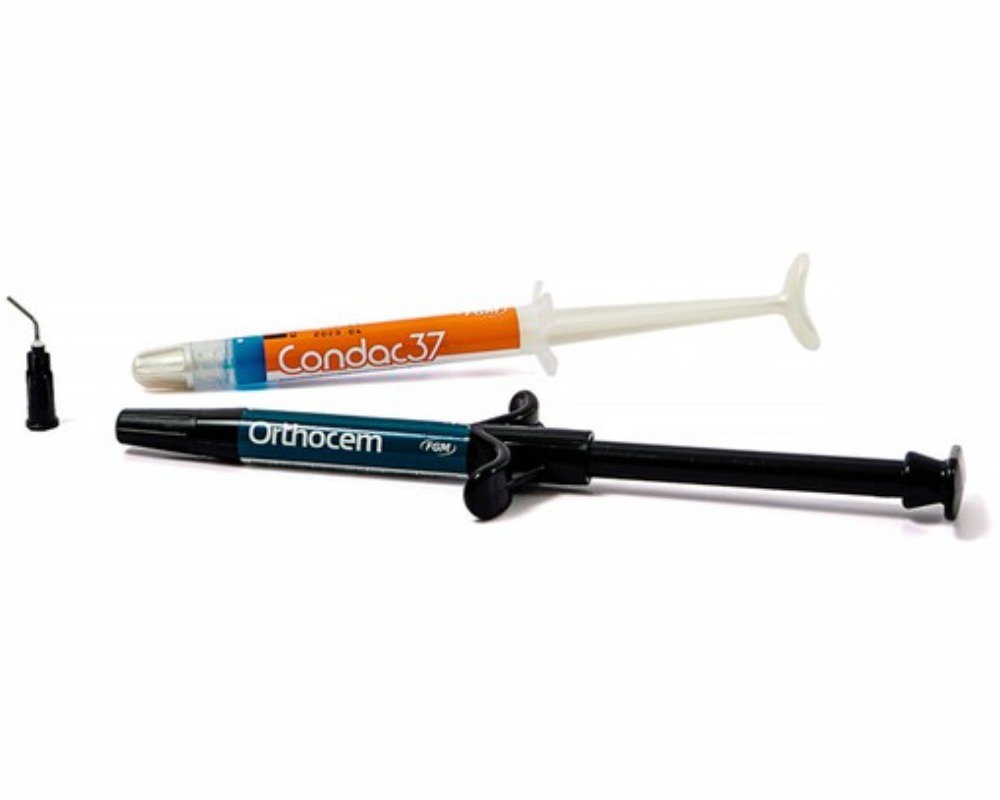 Kit com 1 seringa de Adesivo Ortodôntico Orthocem de 4g + 1 seringa de Condicionador Ácido Condac 37% de 2,5g.