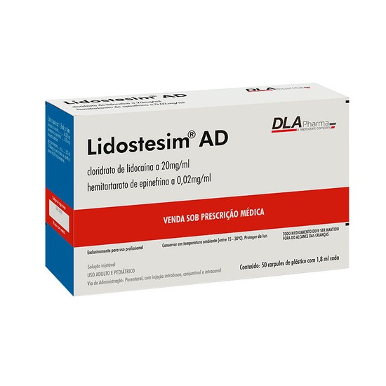 Com vasoconstritor. Solução estéril injetável de Cloridrato de Lidocaína (20mg/ml) com hemitartarato de Epinefrina (0,02 mg/ml), acondicionados em carpules (tubetes livre de metilparabeno) com 1,8ml cada. Embalagem com 50 tubetes de plástico.