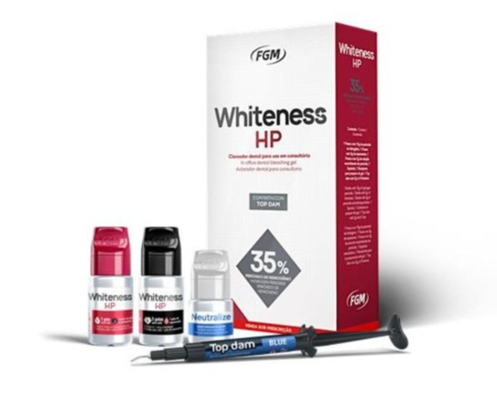 Peróxido de Hidrogênio. Kit com 1 Peróxido de Hidrogênio concentrado 4g, 1 espessante 2g, 01 Neutralize 2g, 1 espátula, 1 placa para preparo do gel e instruções para o profissional.