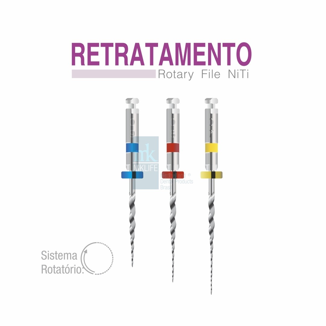 Kit com 3 unidades para desobstrução de canais já tratados, remove a gutta percha facilmente sem necessidade de solvente, Excelente resistência mecânica e fácil de utilizar.